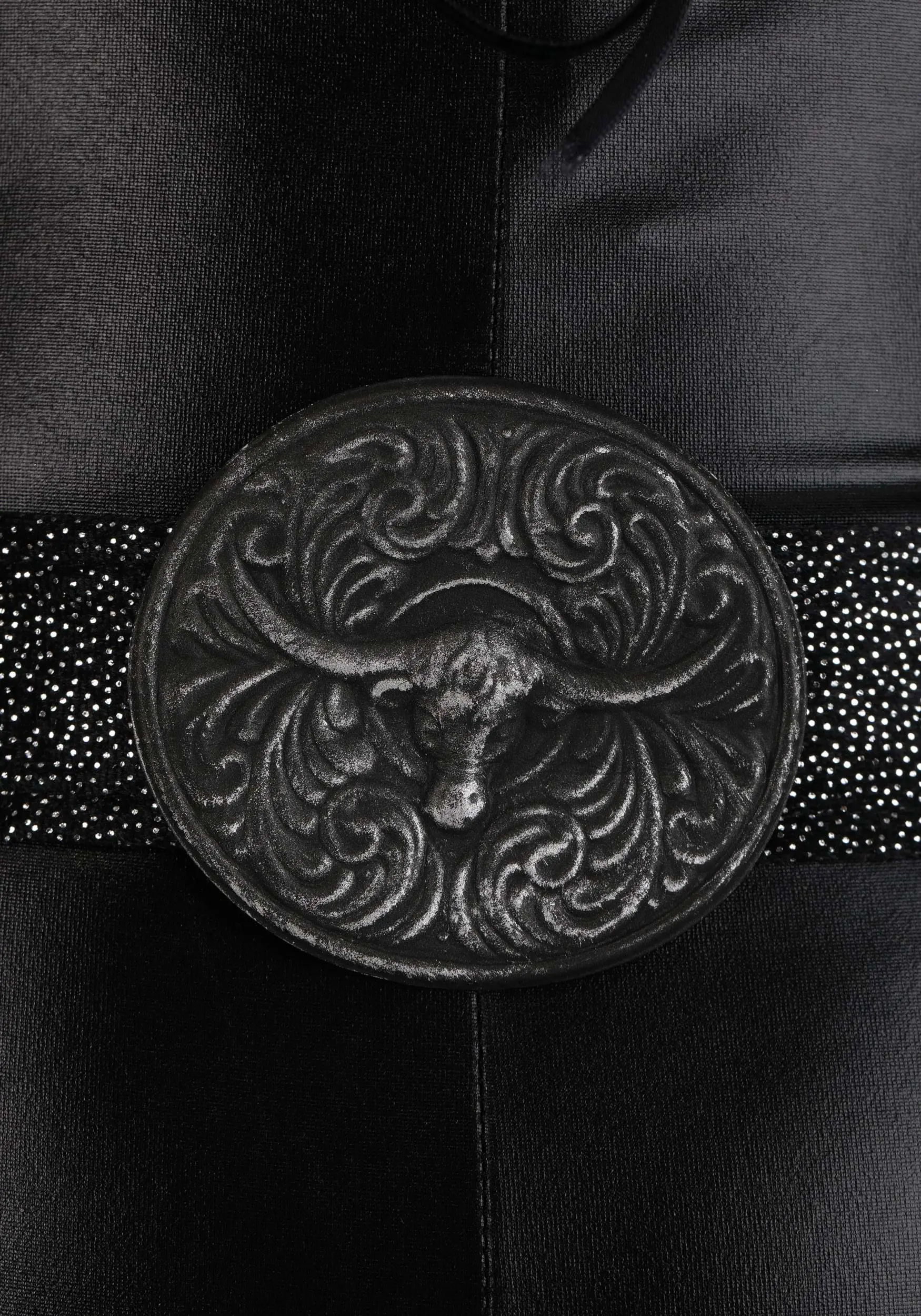 - Metallic knit belt has hook & loop fastener at back, foam “buckle” at front painted to look like antique silver