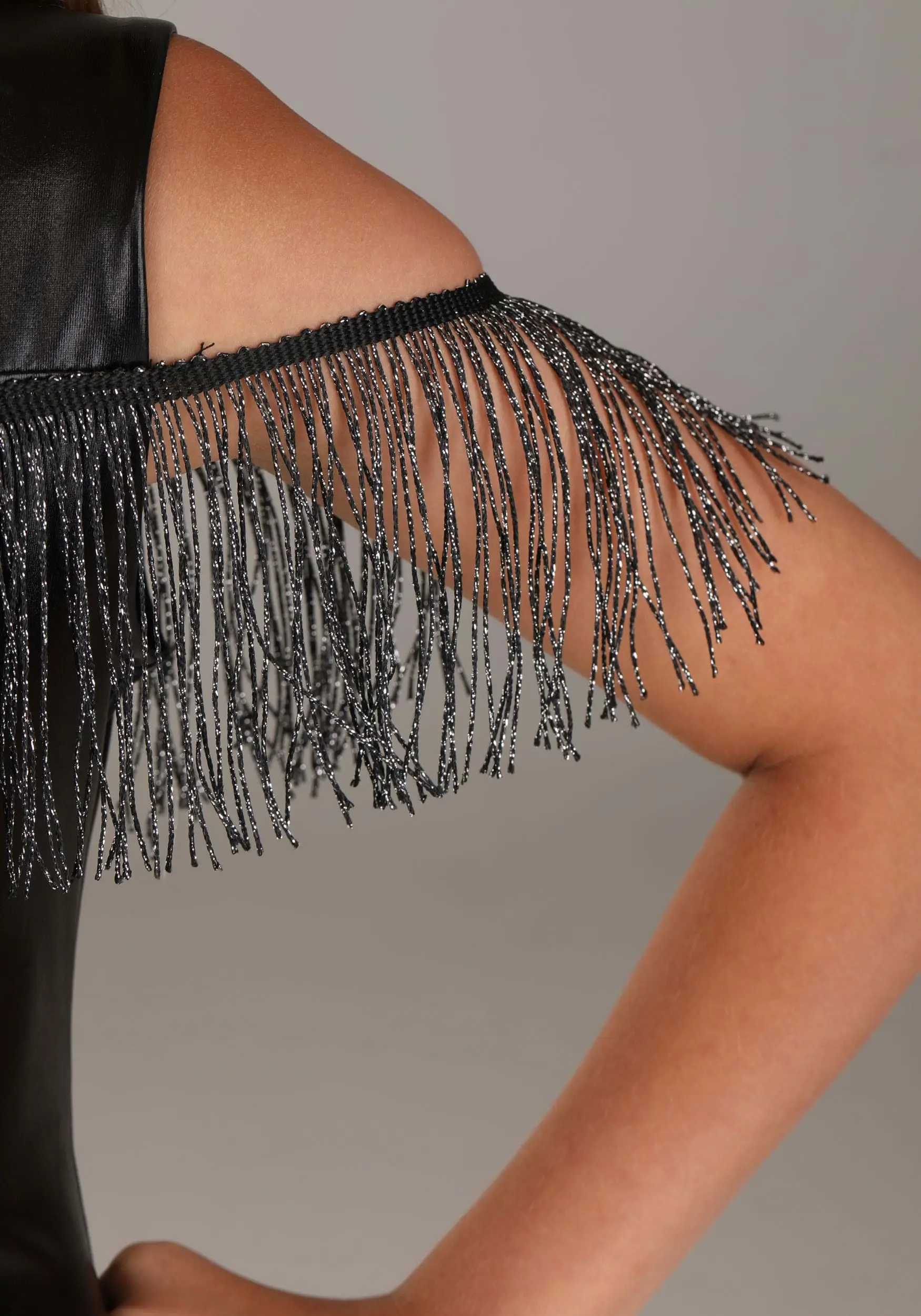- Bands of black & metallic silver fringe attached at base of shoulder straps form off-shoulder “sleeves”