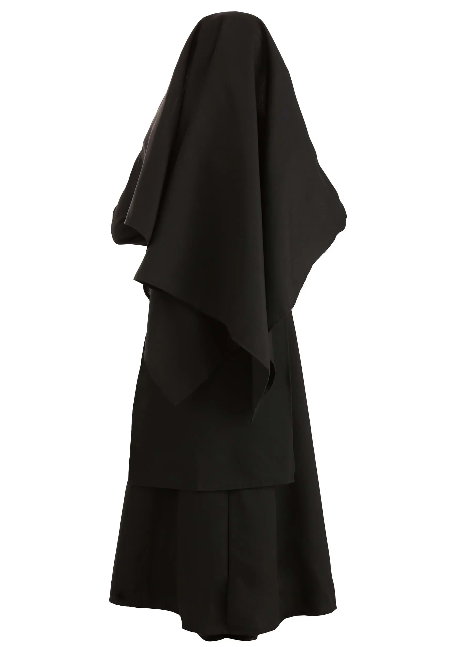 This costume is made exclusively by us, with the utmost attention to detail. Though it looks like an authentic nun’s habit, the quality is as if a group of angels hand-stitched this piece by hand while harp music played in the background. It’s a black dress with a back zipper and matching tabard that ties at the back of the neck, as does the collar. The head cap fits like a balaclava and covers the head and neck, while the veil fastens with ties. Add accessories like a rosary, sensible black shoes, or a cross necklace for added effect!