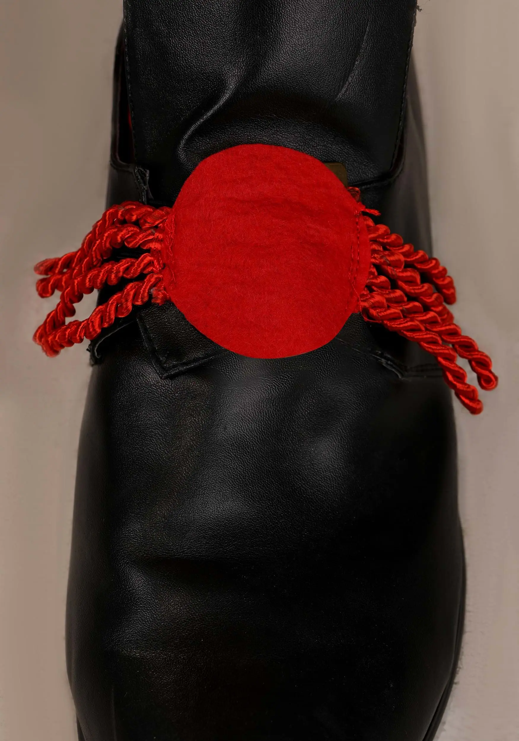 - Red felt shoe ornaments w/ cord fringe trim have elastic bands around instep