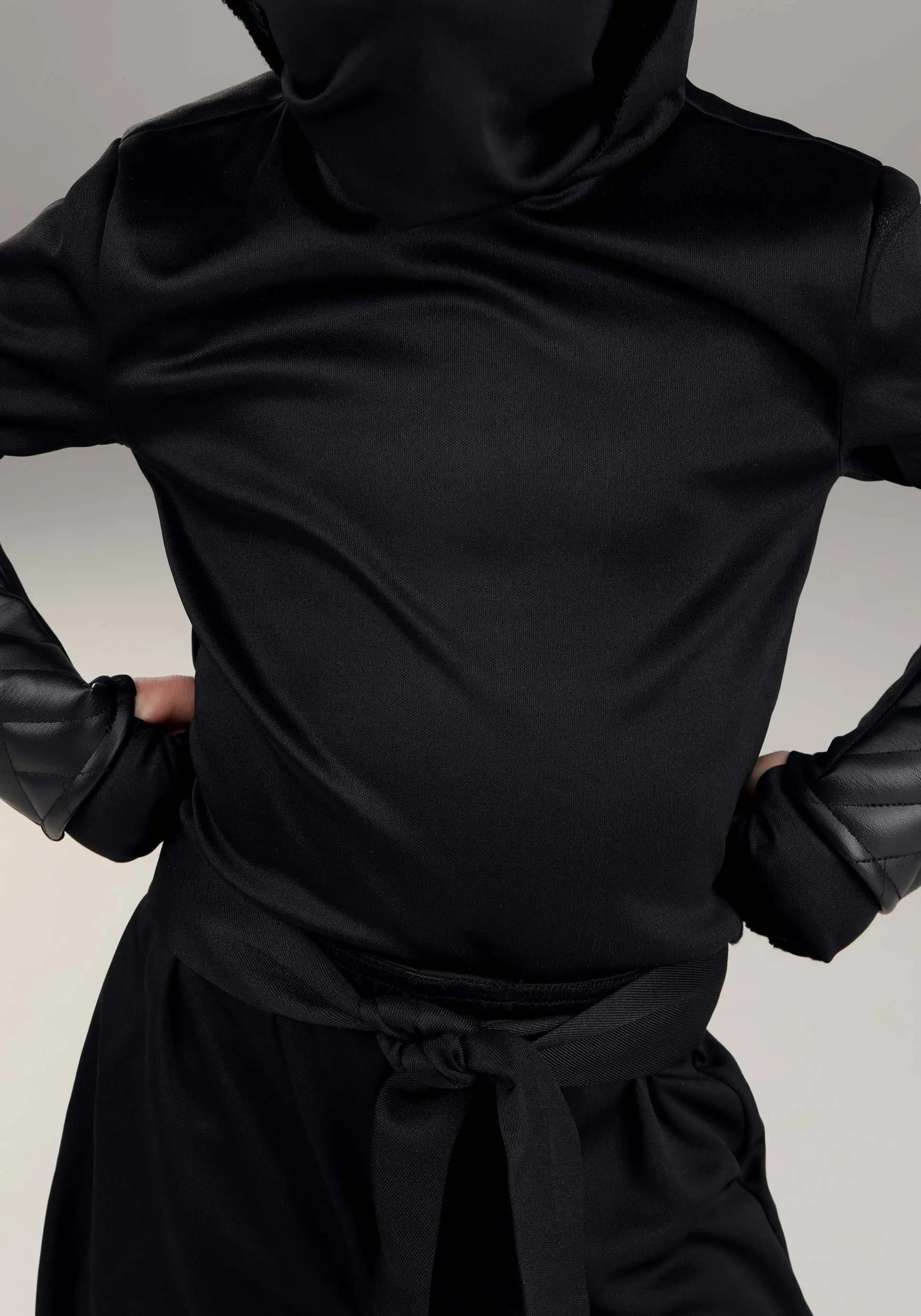 Becoming a sneaky ninja is more than putting on a costume, but if you feel like you already are one on the inside, then go ahead and try out this Toddler Stealth Shinobi Ninja Costume! This “Made By Us” costume was put together by our hard working and careful artisans, so you will feel good about wearing this for years to come. The included top, pants, arm and leg shields, belt, headband, and mask are all that you need to turn yourself into a ninja. This all-black costume is perfect for making your way through the shadows unseen, and you can be sure that no one will so much as hear one piece of fabric rustling against another in this seamless costume!