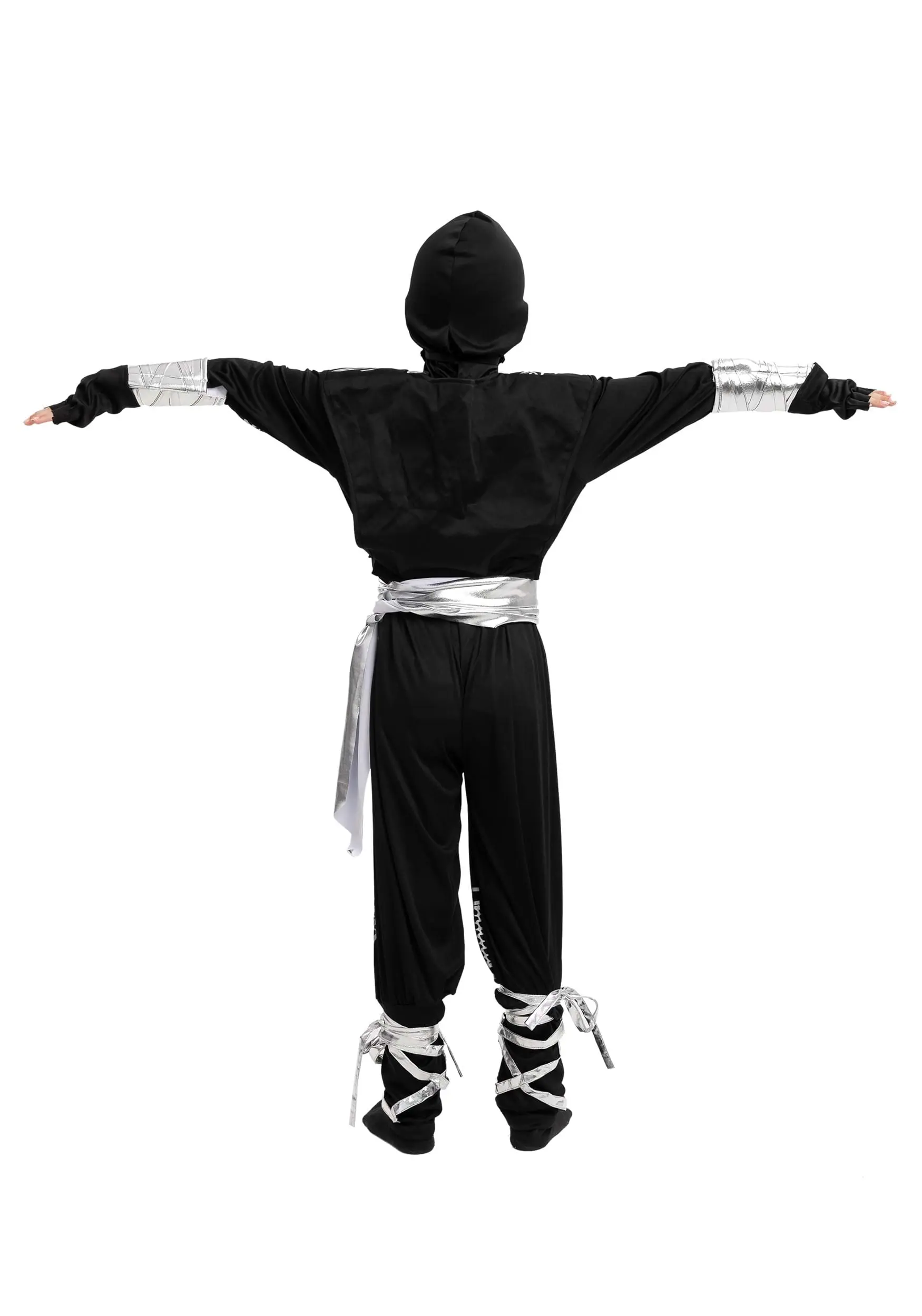 Help your tyke channel their mystical might when you give them this Child Dragon Ninja costume. This ensemble includes all that your kiddo will need to feel like they stepped right out of an epic video game or anime! The black jumpsuit features metallic printing that looks like a soaring dragon tail. Ribbons at the legs and an attached black hood create a silhouette that will have your kid feeling a real part of the fun. Kid-safe, foam weaponry can be worn on the silver belt or held in hand for an action-packed look. They include faux ninja stars and two foam kunai with open loops for your kiddo’s fingers. They’re just perfect with the fingerless gloves that finish off your little ninja’s transformation.