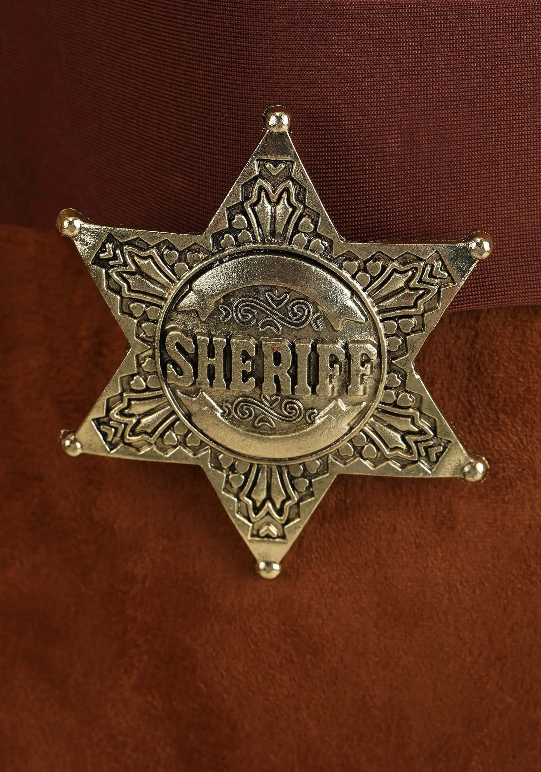 - Metal sheriff badge has a safety pin on the back, secures to belt
