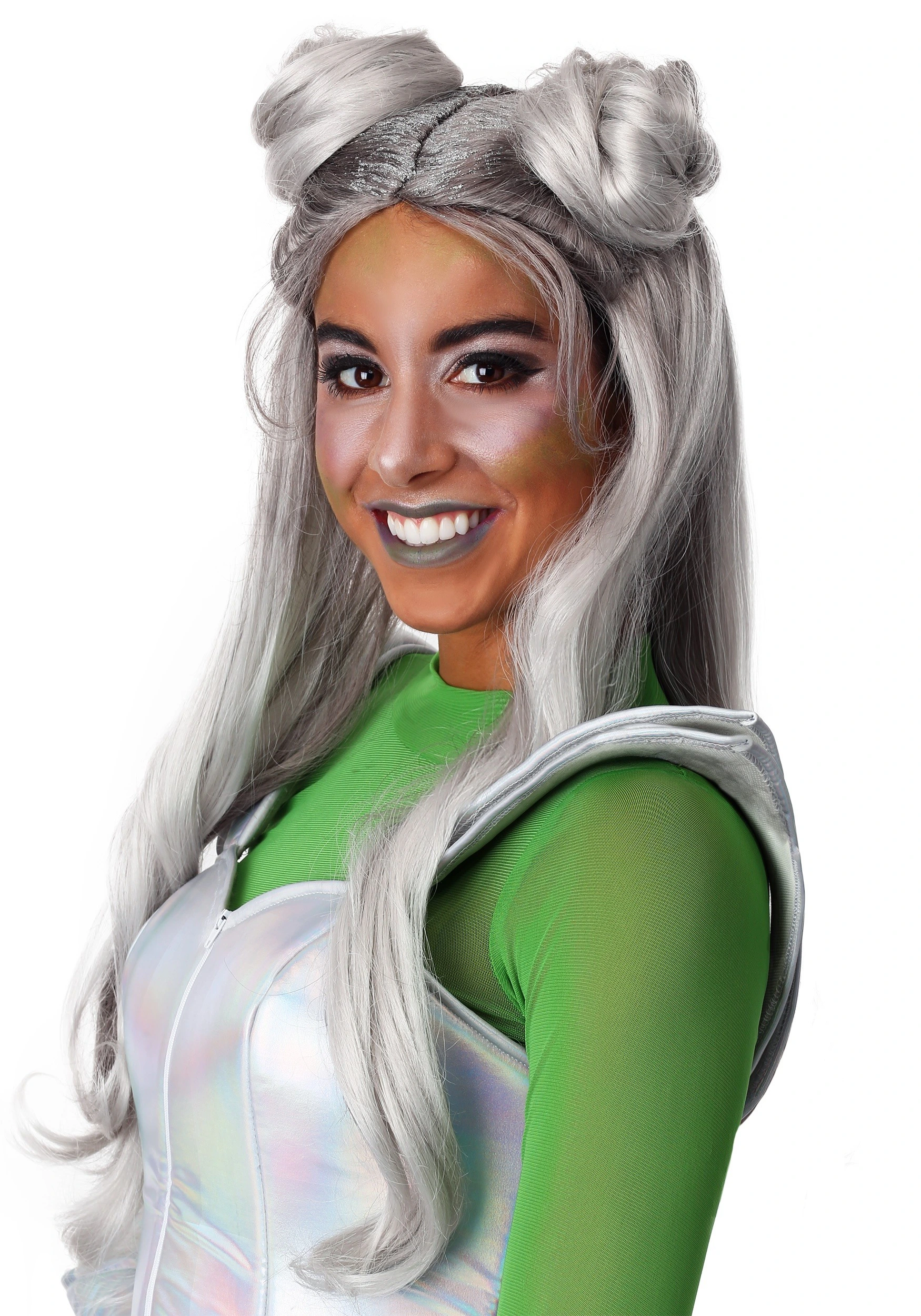 Our costume enthusiast designers drew-up the look for this Made-By-Us wig. We imagine that the silver color would be all the rage in outer space. When mixed with the wild buns and long, curling hair, you’ll top off any intergalactic costume with style.
